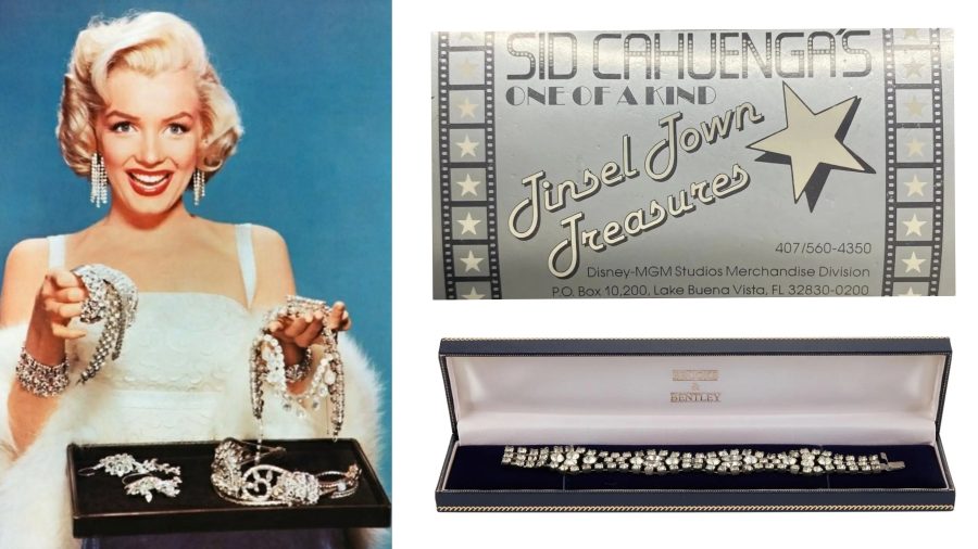 A vintage 1950s rhinestone bracelet designed in a wave-like pattern, hallmarked ‘Kramer of N.Y.’; bought in the 1990s by the current owner at Sid Cahuenga’s One of a Kind Tinsel Town Treasures at Disney World in Florida. Sold with a 1953 photo by John Florea, showing Marilyn posing with rhinestone jewellery. Once again, however, the product has no real connection to Marilyn.