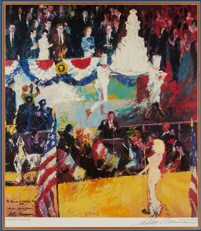And finally… ‘The President’s Birthday Party,’ a 1989 print signed by artist LeRoy Neiman, depicting Marilyn’s ‘Happy Birthday Mr President’ performance for John F. Kennedy at Madison Square Garden on May 19, 1962. (Presented in a white mount with a black wooden frame.)