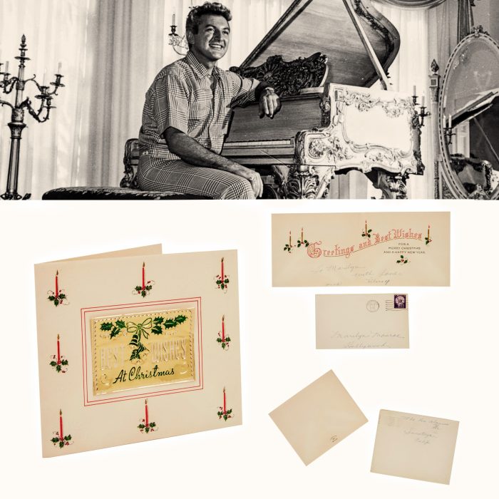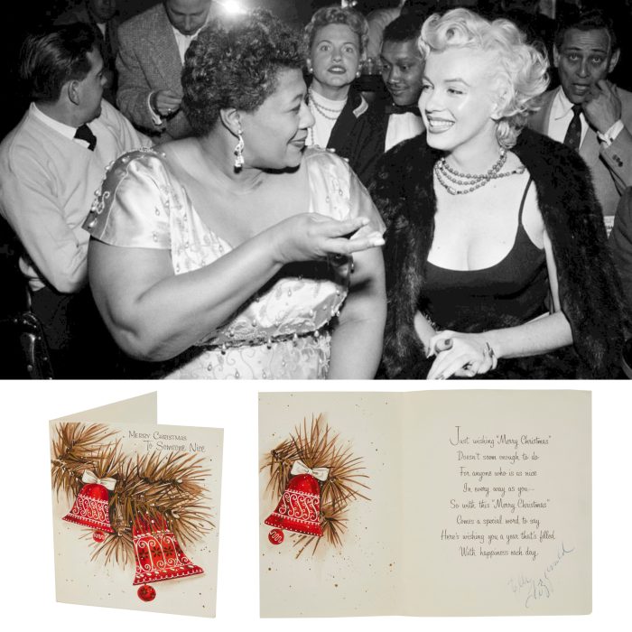 Another Christmas card with handwritten inscription, from jazz singer Ella Fitzgerald; probably sent in 1954, shortly after Marilyn watched Ella’s show at the Tiffany Club in Los Angeles. (Last sold at Julien’s for $1,875 as part of the 2016 auction, ‘Property From the Estate of Lee Strasberg’.)