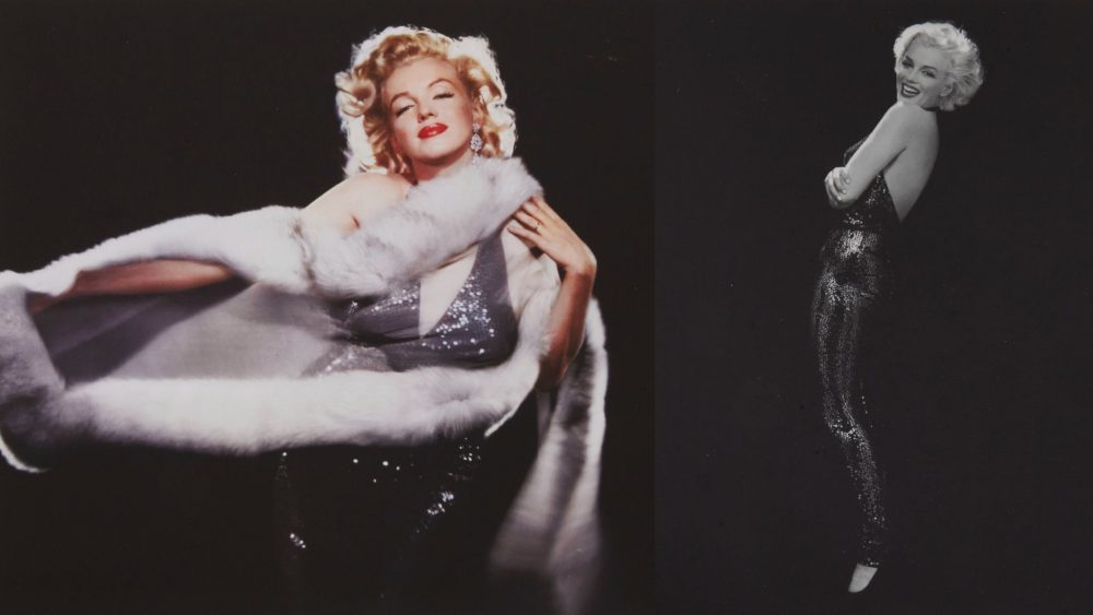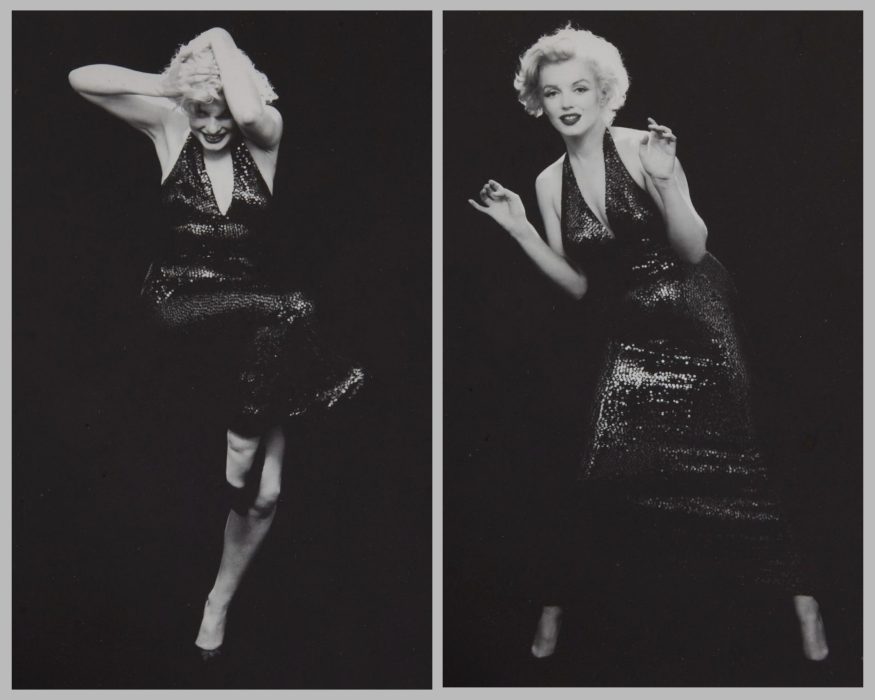 Sold separately, two lesser-known poses of Marilyn – wearing a black sequinned ‘mermaid gown’ by Norman Norell – from a photo shoot with Richard Avedon, whose estate stamp appears on the verso of these 1999 prints.