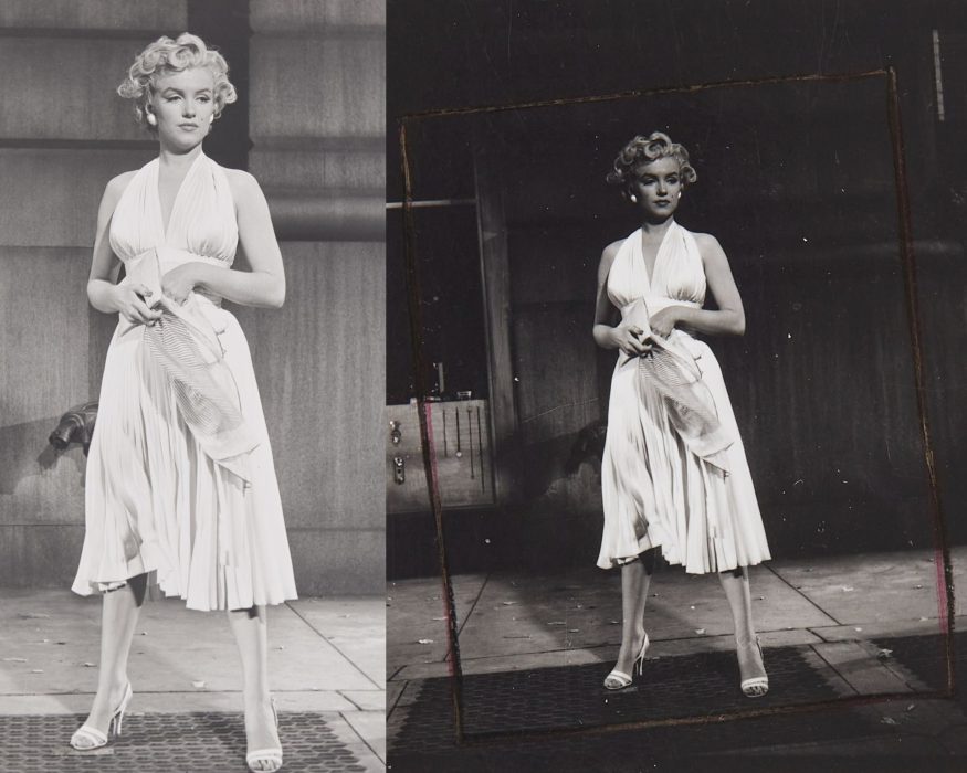 A 1970s print, together with the original negative and a tiny contact sheet cutout, showing Marilyn shooting the famous ‘skirt-blowing scene‘ from The Seven Year Itch over a subway grate on the corner of 52nd Street and Lexington Avenue.