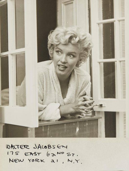 Marilyn photographed in September 1954, while shooting exteriors for The Seven Year Itch at 165 East 61st Street, a brownstone house in Manhattan. This original print’s verso features handwritten text denoting photographer Walter Jacobsen‘s name, and (presumably) his address.