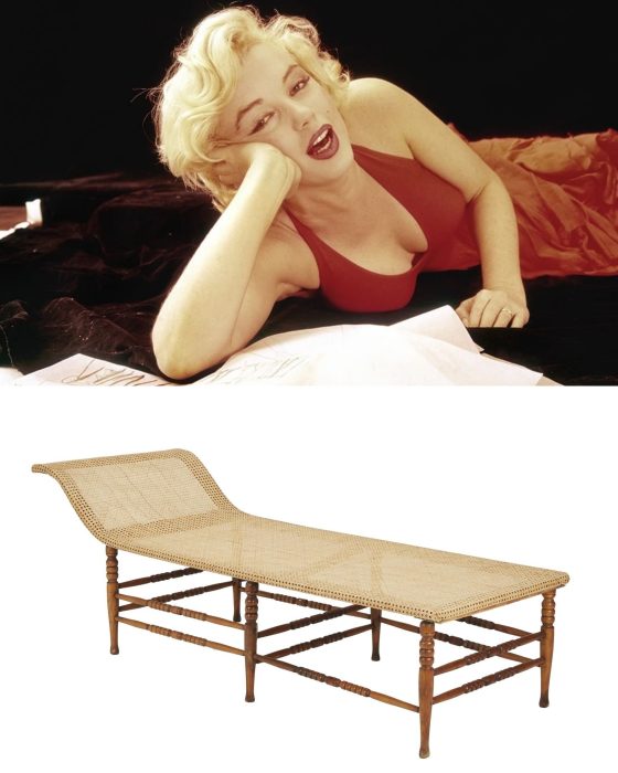 A ‘lightweight but sturdy’ chaise lounge owned by Marilyn, with caning and a wood-turned frame.