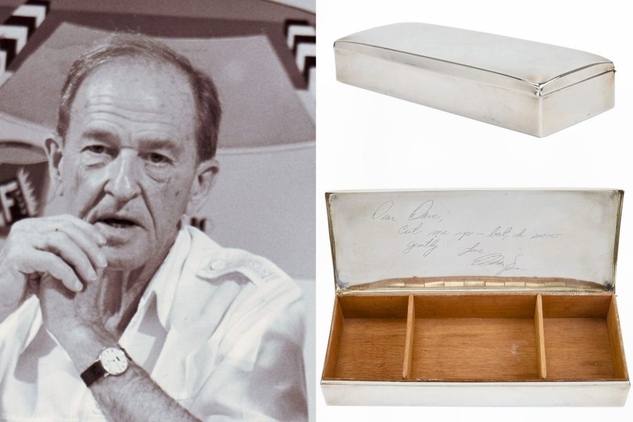 “A sterling silver-engraved cigarette box, with inside lid engraved in Marilyn’s hand ‘Dear Dave, Cut me up – but oh soooo gently / Love Marilyn’; gifted to David Bretherton, the film editor on Let’s Make Love; Marilyn was known to give engraved sterling silver gifts such as this, but only to very close associates or friends, so not many pieces like this are out there.”