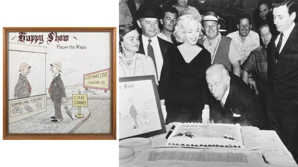 “An original gouache and ink drawing created by the art department at Twentieth Century-Fox; depicting character actor Wilfrid Hyde-White at a cab stand next to a sign reading ‘Let’s Make Love/Cukor Co.’, further text on the left side reads ‘Happy Show From the Kids’, signed in various colors and types of ink by his cast and crewmates including: Marilyn Monroe who added ‘Love and Kisses’, Yves Montand, Tony Randall, George Cukor, Arthur Miller, Allan ‘Whitey’ Snyder, Agnes Flanagan, Evelyn Moriarity, Paula Strasberg, and Kenneth Kendall [famous for the sculpture he created of James Dean at Griffith Observatory which is still there today], among others; included with a black and white image showing this piece resting on a table as Marilyn and other cast members stand right next to it.” (Presented to Mr. Hyde-White on May 12, 1960, for his 57th birthday.)