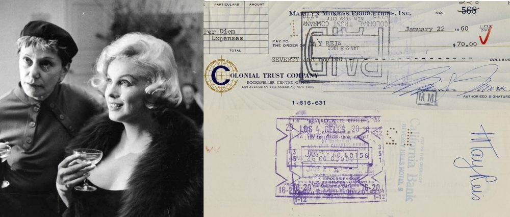 A Marilyn Monroe Productions (MMP) cheque for $70, made out to secretary May Reis on January 22, 1960, with Marilyn’s signature.