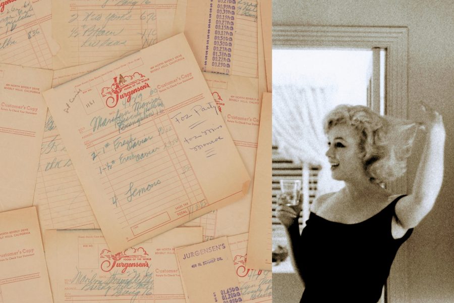 “A group of 12 receipts from Jurgensen’s Grocery; all noting Marilyn’s name and address of ‘Beverly Hills Hotel’, all from the fancy supermarket on Beverly Drive in Beverly Hills, dated from April 20 to May 25, 1960 during the time when Marilyn and Arthur Miller were living at the hotel in ‘Bungalow 16’ during the production of Let’s Make Love; Marilyn appeared to order delivery from the market almost daily and sometimes even twice a day; she also requested pick-up service as evidenced by Hazel Washington’s [her longtime Los Angeles maid] name on the bottom of many of the receipts; Marilyn was buying standard staples like bacon, cheese, and lemons, but she also glammed it up with fresh caviar, among other items; further included are two separate cash register receipts (five others are stapled to the actual receipts from the store).”