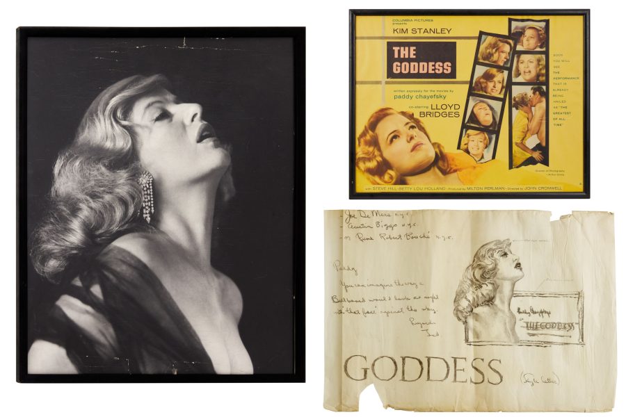 “A c.1979 xerox of Paddy Chayefsky’s original 132-page first draft script of The Goddess (Columbia Pictures, 1958) with original date of April 1, 1957 … Laid in is a note from agent Paul Schwartzman on ICM notepaper that reads, ‘After 22 years! Paul.’ Revised scripts for the film are 126 pages so this first draft features additional scenes and dialogue.” (Chayevsky was nominated for an Academy Award for his story of a doomed film star, loosely based on Marilyn Monroe.)
