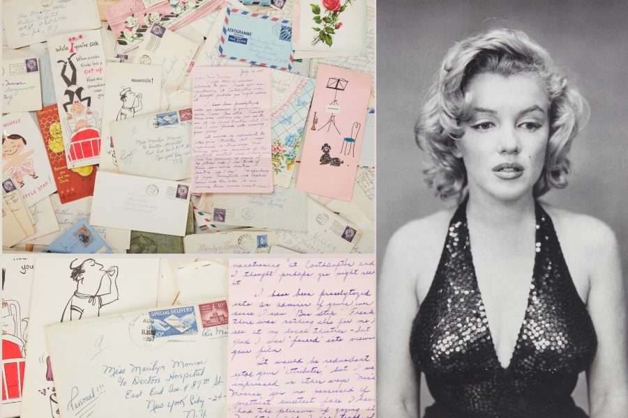 At left: “A group of approximately 100 fan letters; all housed in a vintage brown accordian file; mostly addressed to the star at either Doctors Hospital in NYC or Warner Bros in Burbank, CA; including many get-well cards (from when she suffered a well-publicised ectopic pregnancy in August 1957), birthday cards, handwritten and/or typed letters, and postcards from fans all over the United States as well as the rest of the world; content ranges from young kids asking for a signed photograph to adults pouring out their hearts and souls to this woman they never met but felt like they knew personally — the power of Marilyn which still resonates today, 60+ years after her death.”