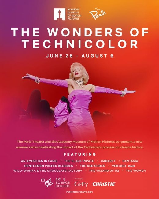 Gentlemen Prefer Blondes is showing at the Paris Theatre on West 58th St. in Manhattan tomorrow, July 12, at midday, and again on Tuesday, July 15 at 7 pm, as part of a summer film series, ‘The Wonders of Technicolor,’ in association with the Academy Museum in Los Angeles, where the exhibition, ‘Colour in Motion,’ closes on Sunday, July 13.