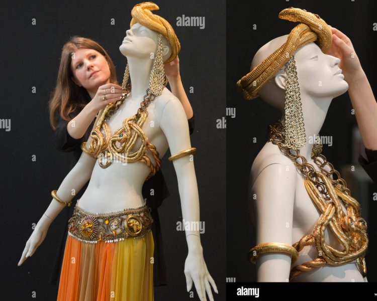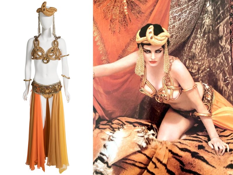 “Costume consists of a skirt of orange and yellow chiffon scarves attached to a gold lamé bikini bottom with an ornate belt of embossed leather encrusted with amber colored faux jewels, a gold lamé top with metal chain halter designed with snake motif cups with faux emerald ‘snake eyes’ and centre textured metal gold-toned ring with four amber colored faux jewels, together with matching snake motif headdress of padded gold textured fabric with three amber colored faux jewels and hanging faux chainmail ornamentation on each temple, and three textured imitation gold metal bangles. Costume exhibits expected age, with some missing and partially detached faux jewels; belt leather is detached in areas with loose/detached trim pieces and missing ornamental ring; one chiffon scarf is detached but present.”