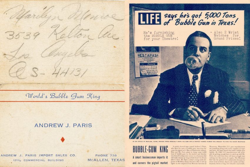 Among the other lots is this intriguing item, a business card for Andrew J. Paris – the Texas-based, self-styled ‘World’s Bubblegum King’ – with Marilyn’s name and address written in her own hand on the verso. She rented rooms at 3539 Kelton Avenue in Westwood, Los Angeles in January 1947 – the first home she lived in alone.