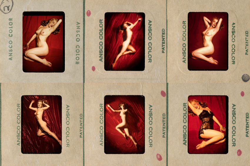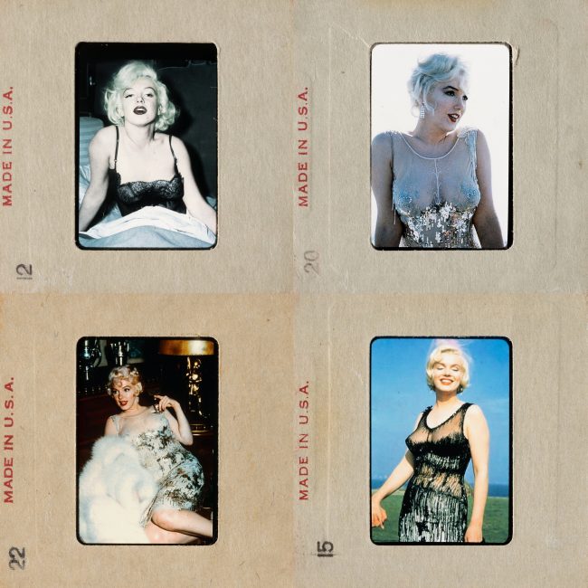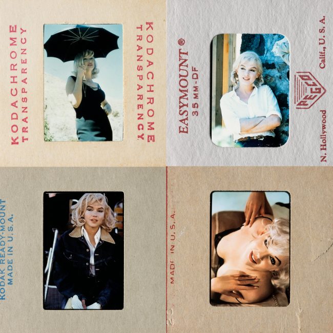 “Vintage 35mm colour transparencies on ANSCO film in original mount (originally produced from 8″ x 10” format camera with Kodachrome colour film transparency) of Marilyn Monroe, May 27, 1949, of ‘Red Velvet,’ Nude Poses #1, #2, #5, #6, #9 for ‘Golden Dreams’ Calendar, 1952, and black lace teddy overlay from Pose #1, for ‘The Lure of Lace’ Calendar, 1955, by Tom Kelley Studios, with PROCESSED BY / PAVELLE COLOR and ANSCO COLOR stamped on the mount.”