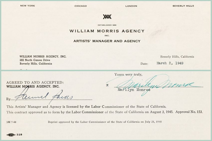 A 2-page management contract with a William Morris Agency letterhead, dated March 2, 1949 and signed by Marilyn. With the support of agent Johnny Hyde, Marilyn secured breakout roles in The Asphalt Jungle and All About Eve before negotiating a 7-year contract with Twentieth Century-Fox in December 1950.