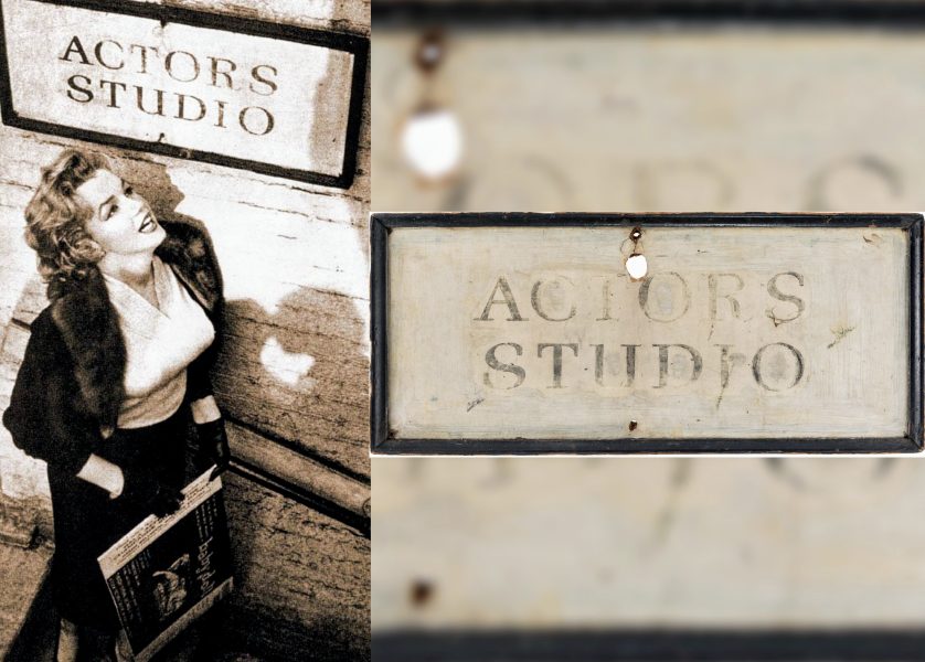 An original Masonite board hand-painted in black letters, ‘ACTORS STUDIO‘ against a painted white background, encased in its original black wooden frame. This sign matches a 1956 photo of Marilyn standing outside the building on West 44th Street in Manhattan, holding up a poster for Baby Doll, as she arrived for a press call to promote ticket sales for the film’s premiere, a fundraiser for the Actors Studio.