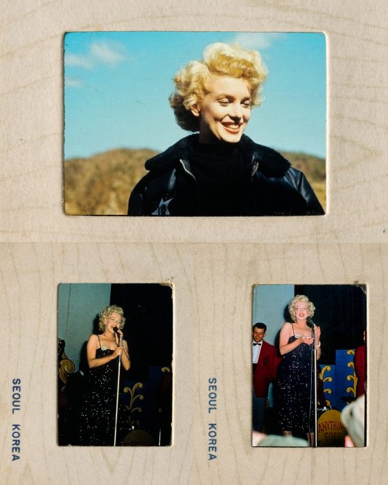 From a set of 35mm colour transparencies on Ektachrome film in original mount, of Marilyn with her ‘Anything Goes’ band for Goodwill Tour for U.S. Troops at Daegu, South Korea, in February 1954, by a U.S. Air Force still photographer. Marilyn is first seen wearing a 6147th B-15 Tactical Control Group jacket, which was standard issue for aircrew and pilots after 1943, loaned by Hilda Benning, the friend of military escort Ollie Palmer. Marilyn later wrote to Hilda: ‘Dear Bugs, Thanks for the loan of your jacket – I didn’t let it out of my sight the whole time – I couldn’t, (Ollie kept reminding me). It kept me soooo warm. Thanks.’