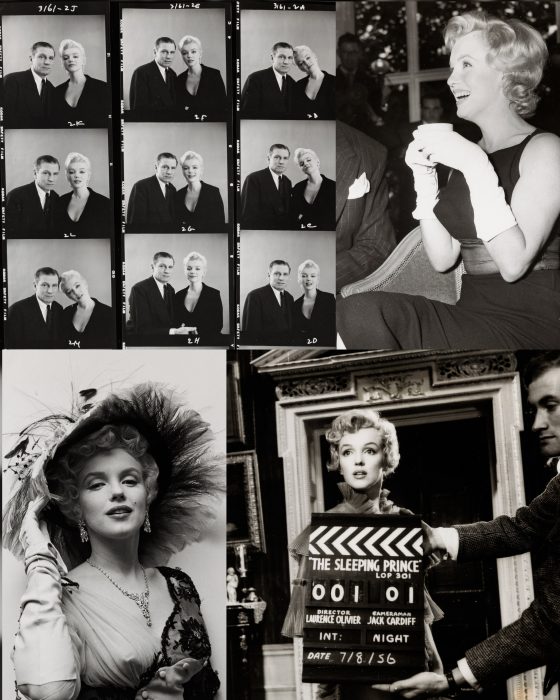 From a set of images by Milton Greene, relating to The Prince and the Showgirl. Includes a contact sheet showing Marilyn at a press conference with her director, co-star and co-producer, Laurence Olivier, at New York’s Plaza Hotel in February 1956; a print showing Marilyn sipping tea during another press conference, at London’s Savoy Hotel in July 1956; and photos from the set of the film, originally titled The Sleeping Prince.