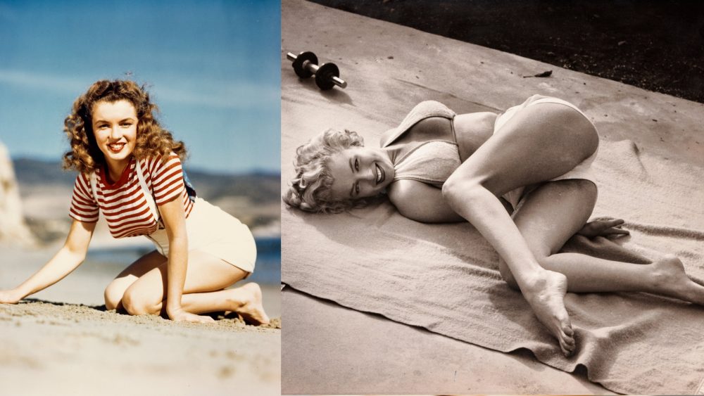 At left, one of two colour prints of Norma Jeane photographed by Andre de Dienes in 1945; and at right, Marilyn posing for De Dienes on the patio of her Hotel Bel Air suite in 1953.