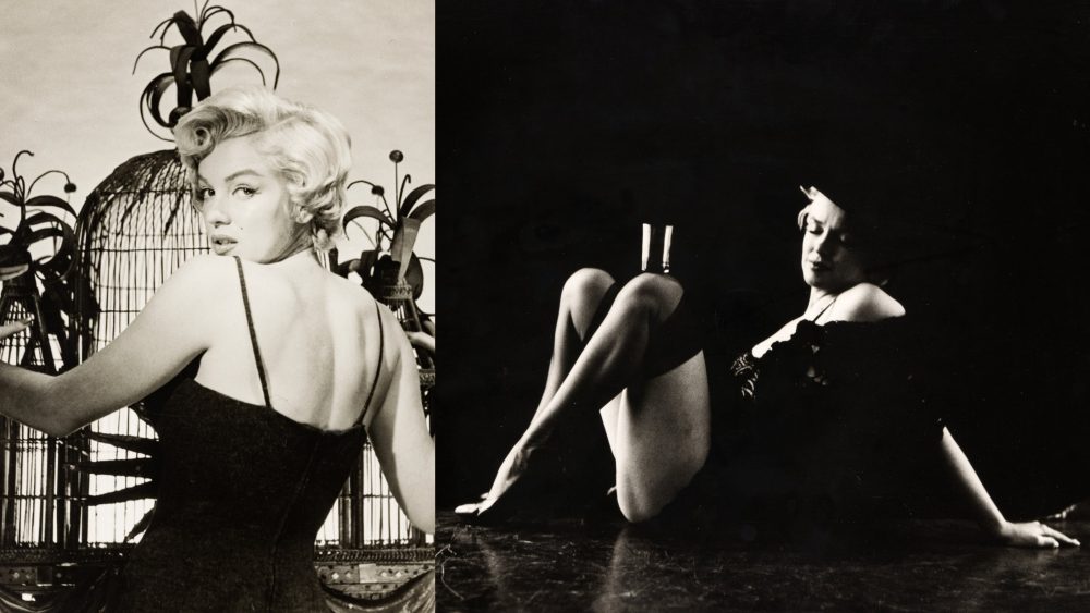 At left, an original 1954 photo by Jean Howard; and at right, an image from the 1956 ‘Black Sitting‘ in a later print by Milton Greene.