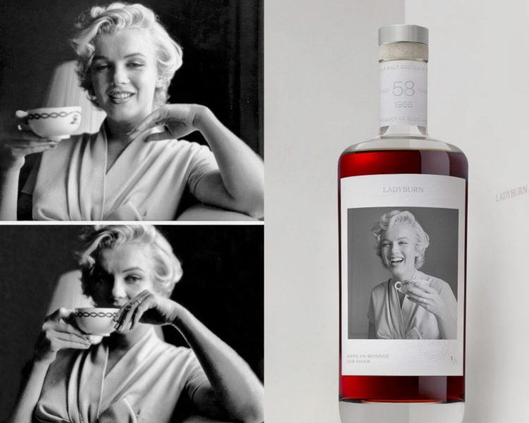 The single bottle has been drawn from Cask 102092, one of a handful of 1966 Sherry butts, and the decanter features Shaw’s photo of a smiling Marilyn sipping from a coffee cup in her suite at the St. Regis Hotel, after arriving in New York to shoot The Seven Year Itch in 1954.