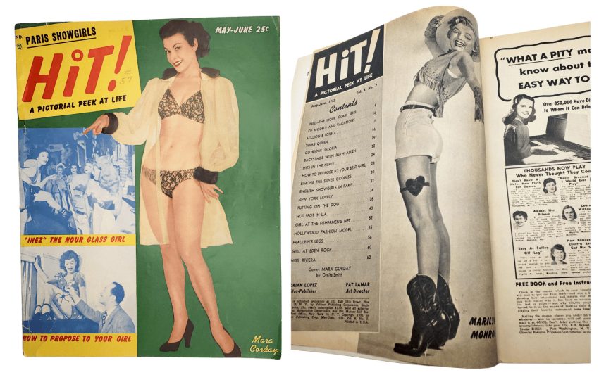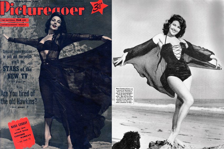 Mara followed the starlet’s familiar path by modelling for girlie magazines, and would grace the cover of Hit! in 1951, with Monroe featured inside. In 1953, Eye named Corday as a ‘sensational new rival’ to Marilyn, as she recreated Monroe’s infamous nude calendar pose in a strapless gold bikini. Her popularity led to a contract at Universal, and an uncredited appearance as ‘Girl on the Balcony’ in Son of Ali Baba (1952), which made a star of leading man Tony Curtis. They worked together again in So This is Paris (1954.)