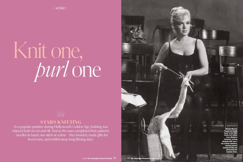 Elsewhere in this month’s Icons, Marilyn appears more tangentially in a feature about stars who knit, with a still photo from Let’s Make Love (1960), as her showgirl character Amanda Dell knits on a break from dance rehearsals. She famously wore an Irish cable-knit sweater in the film’s opening number, ‘My Heart Belongs to Daddy ‘ – only to whip it off by the end, revealing a diaphanous black unitard beneath.