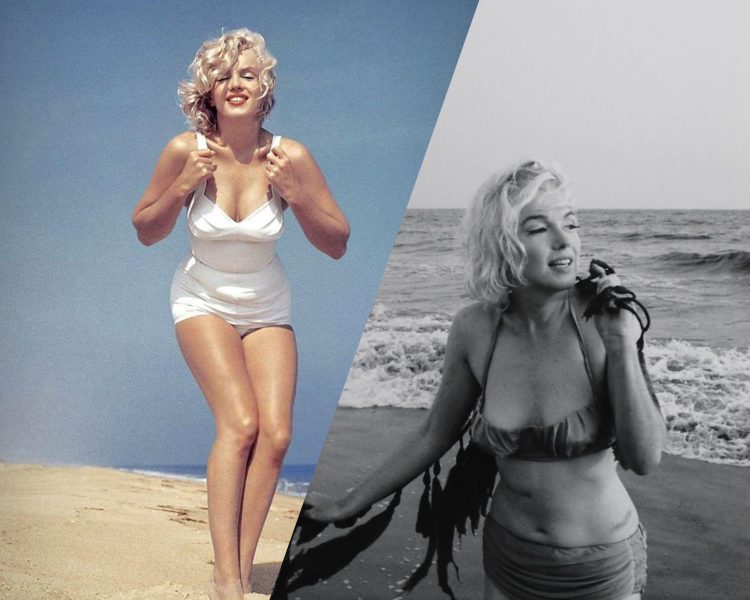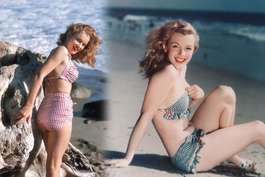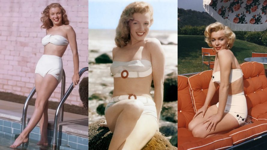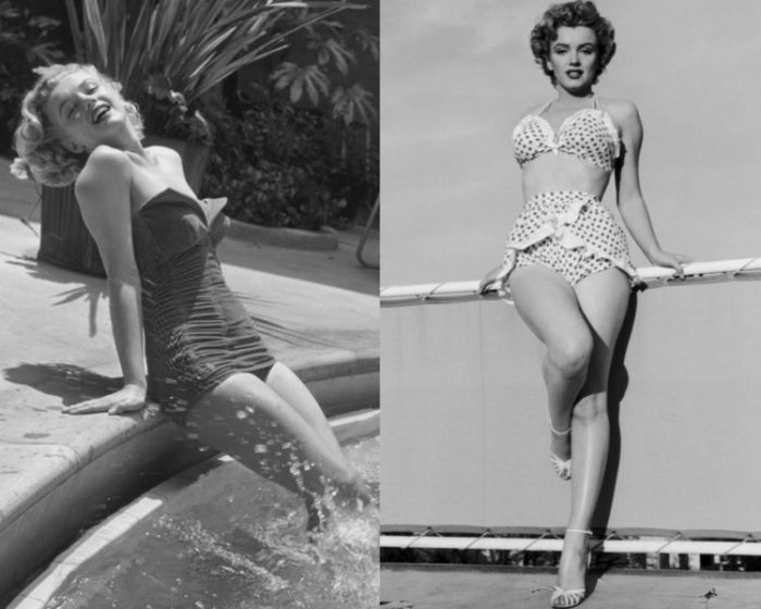 While these 1940s bikinis look rather bulky today, going strapless was then considered daring. With many of these ensembles coming from Marilyn’s own wardrobe, she also experimented with prints and other details, including stripes.
