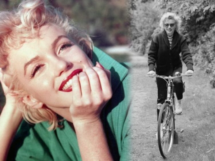 Moving away from the beach, Marilyn had adopted a more sophisticated style by 1954, wearing a green shirt and slacks for a garden shoot with Baron; and in 1956, while cycling in England’s cooler climes, she paired white sneakers and a dark knit cardigan with her striped top and plain slacks.