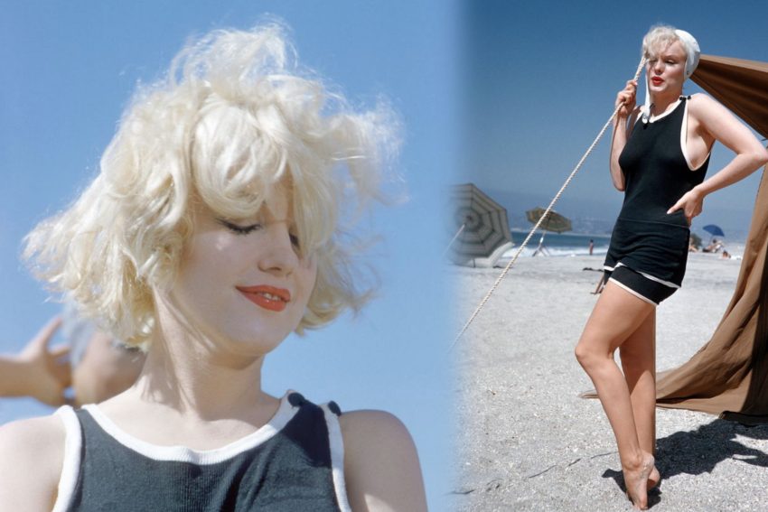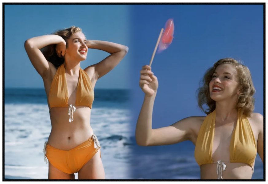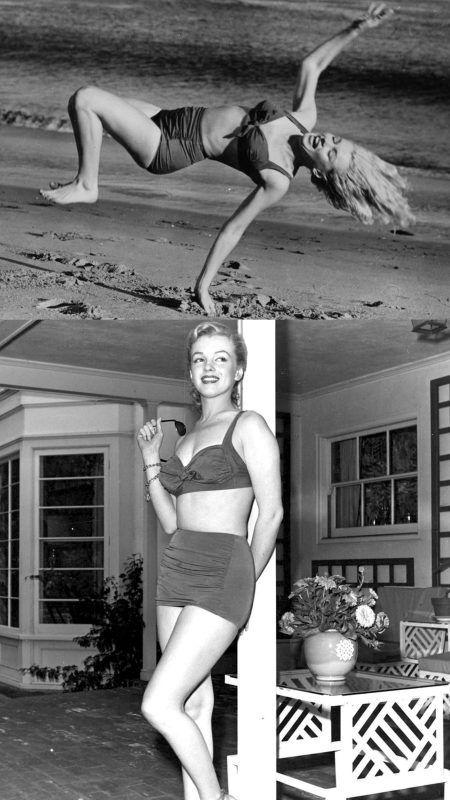 Vogue has posted an online gallery showcasing Marilyn’s vintage ‘summer vacation style,’ mostly from her early modelling days. She wore this yellow string bikini in photo shoots with Richard C. Miller, Laszlo Willinger, and Bruno Bernard.