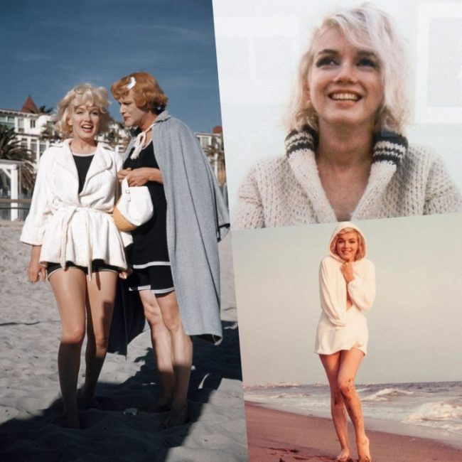 Marilyn’s 1920s bathing suit from Some Like It Hot – recently sold at Julien’s Auctions – doesn’t reflect her own fashion era. However the white towelling beach jacket she wore with it is similar to a number of items she favoured.