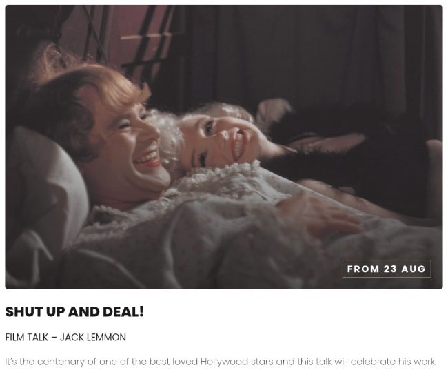 We are very much looking forward to welcoming film writer and lifelong Lemmon fan, Hannah Gatward, who will give a talk on Jack Lemmon illustrated with many of his film clips on August 23 at our mobile cinema in Chichester. This will be not only educational, but a true delight.