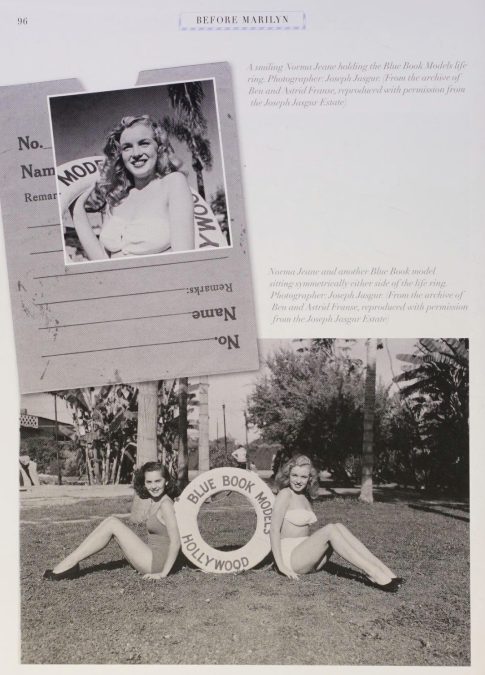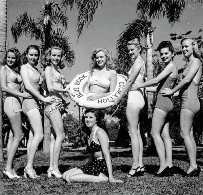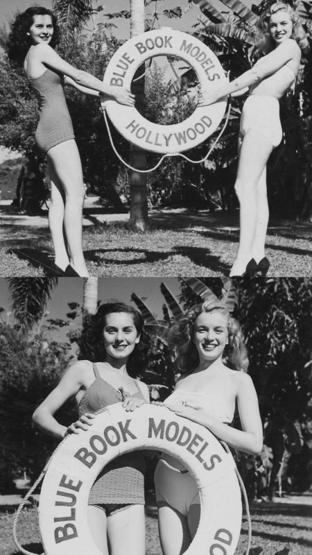 In this photo, Norma Jeane stands in the centre, as two other models hold a lifebuoy ring with a ‘Blue Book Models Hollywood’ logo around her. The models have not been identified, but the brunette at second from right looks rather like Joan Anderson. In other shots, Norma Jeane holds the lifebuoy with a brunette wearing the same bathing suit as Joan in the group picture, although her hair has been let down.