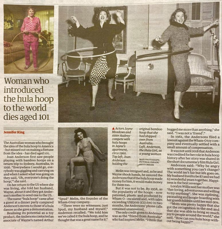 Joan Anderson, the Australian-born model who brought the hula hoop to the US, has died aged 101. She was born Joan Constance Manning in Sydney in 1923, daughter of a property agent, and began modelling swimsuits in her teens, becoming known as the ‘Pocket Venus’ as she was barely five feet tall. In 1945, she met an American GI, Wayne Anderson, on Bondi Beach. They married four months later and moved to Pasadena, and Joan signed up with the Blue Book Modelling Agency.