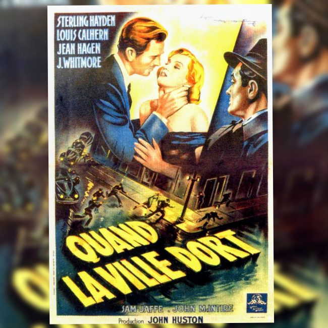 The Asphalt Jungle, which turns 75 this year, is showing at the Cinéma L’Aiglon in the Orne area of Normandy on Sunday, October 5, at 6 pm CEST. (Following its US premiere in May 1950, The Asphalt Jungle reached France that December. An original French poster is shown above, with an alternate title which translates as ‘When the City Sleeps.’)