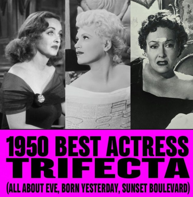 “The competition was truly epic … Many believe Eve co-stars Bette Davis (a two-time winner on her ninth out of 11 nominations) and Anne Baxter (a previous Best Supporting Actress winner) cancelled each other out, with the thought that Davis would have been a shoo-in if Baxter had been placed in the supporting category. But then there’s Gloria Swanson, whose epic comeback in Sunset Boulevard resulted in her third Oscar nomination … So, two legendary actresses playing legendary actresses, along with an actress playing an ingenue who stole a role from one of the aging actresses, were all competing against one another. And the Oscar went to … comedienne Judy Holliday, winning on her sole nomination for reprising her acclaimed Broadway role of Billie Dawn in Best Picture nominee Born Yesterday, and was the only win out of five nominations for that film. Eleanor Parker rounded out the category for Caged, earning her first of three career nominations.”