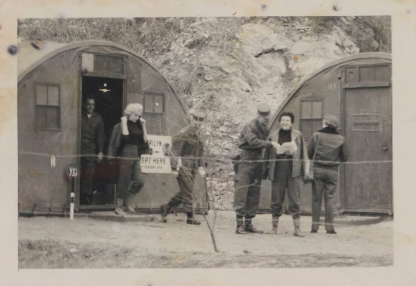 Jean O’Doul, wife of Joe’s baseball buddy Lefty O’Doul, can be glimpsed alongside Marilyn and US soldiers in some images.