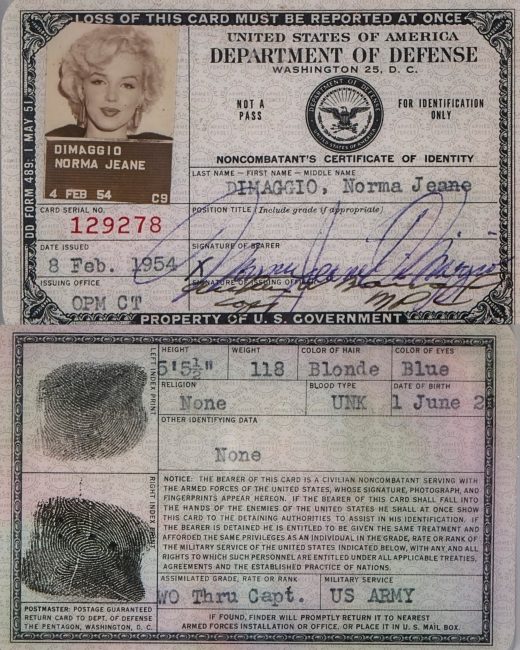 In the first of four posts on this auction, I’m taking a closer look at the star-crossed DiMaggio romance. Among thirty Monroe-related lots, the highest selling item (and seventh highest overall) was her US Department of Defence identification card, signed under her legal name of Norma Jeane DiMaggio on February 8, 1954 – fetching $176,400.