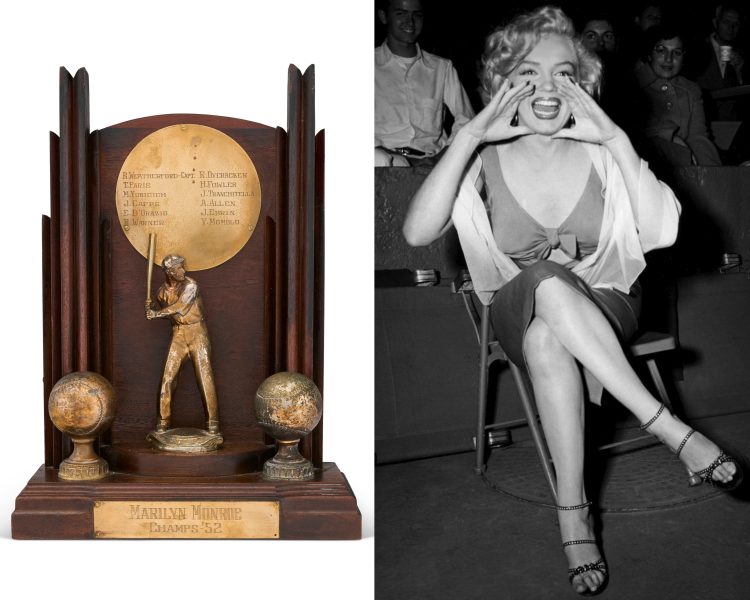 Although not much of a baseball fan herself, Marilyn’s relationship with the sport pre-dated DiMaggio. While promoting Love Happy in 1949, she acted as mascot for a Chicago Cubs game at Wrigley Field; and in 1951, she posed with members of the White Sox. These shots caught Joe’s eye – and after they started dating, Marilyn played celebrity mascot at charity games in Los Angeles and was awarded a metal disc reading ‘Marilyn Monroe Champs – ’52‘, presented on a wooden plaque. This award, which has sold for $1,764 at Christie’s, also reflects her popularity with troops overseas, as a ‘Capt. Weatherford’ is named on the disc, suggesting this was a servicemens’ team.