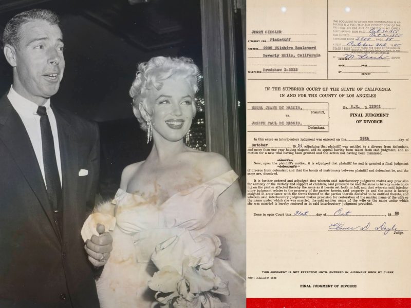 An original press photo of Joe and Marilyn at the New York premiere of The Seven Year Itch on June 1st, 1955 (Marilyn’s 29th birthday), which sold for $3,528, is captioned ‘HOLDING HANDS AGAIN.’ But while they remained good friends, there was no reconciliation. A final judgement of divorce, stamped by the California Superior Court on October 31, 1955, has been sold for $12,600.