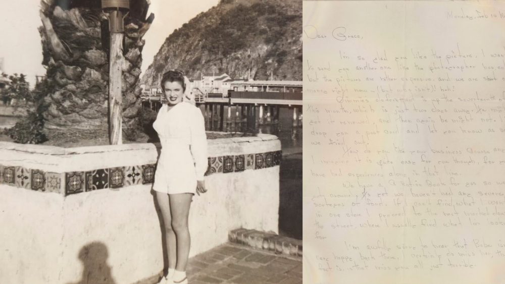 At left, a snapshot of 17-year-old Norma Jeane in 1943, while living on the naval base at Catalina Island where her husband, Jim Dougherty, was in training for the Merchant Marines (sold for $6,300.) And at right, a five-page letter from Norma Jeane, dated February 16, 1943, and signed off as ‘N.J.’, to Grace Goddard, who was then living in Huntington, West Virginia. Acquired by Dr. Espy in 2001 at a charity auction for Hollygrove Children’s Home (where Norma Jeane lived from 1937-38), the letter sold for $35,280 at Christie’s this week.