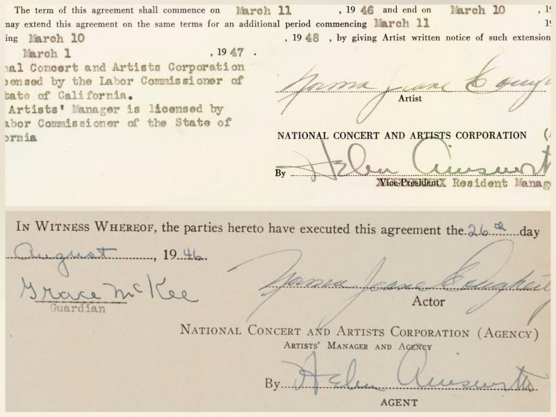 A one-page contract dated March 11, 1946, dating how the National Concert and Artists Corporation will represent the 19-year-old ‘N.J.D.’ over the next year. Co-signed by agent Helen Ainsworth, this document has sold for $18,900. And another NCAC contract, dated August 26, 1946, and now sold for $10,080, is signed by Norma Jeane Dougherty – by now separated from Jim, and soon to commence her film career – plus Ainsworth, and Grace Goddard, who would remain as Norma Jeane’s legal guardian until her 21st birthday.