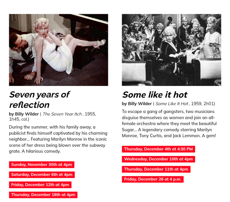 Marilyn’s two hit movies with director Billy Wilder are featured in a bumper series of classic Hollywood comedies at the Lumière Institute in Lyon. The Seven Year Itch (1955) is showing on December 6, 12, and 18; and Some Like It Hot (1959) on December 10, 11, and 26.