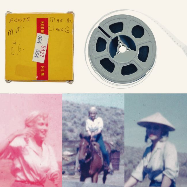 A single-reel, colour home movie, shot in Nevada amid production of The Misfits in 1960, running for a total 4:26 minutes, with Marilyn appearing for around 1:20 minutes. She is first seen wearing a white sleeveless blouse with jeans, and later dons a long-sleeved blouse and straw hat while on horseback. Other actors are also featured, while the remaining footage shows the teenage girl who shot the film at home with her family in Reno, where her father owned a restaurant visited by director John Huston.