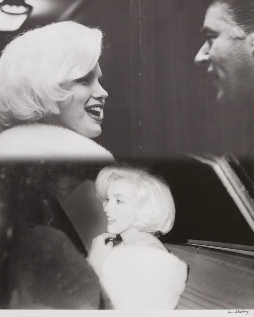 Moving forward, these two images were captured on May 19, 1962, on the night when Marilyn sang ‘Happy Birthday Mr President’ to President John F. Kennedy. The first, a 2000 print showing Marilyn with master of ceremonies Peter Lawford, including a stamp on the verso crediting photographer Victor R. Helou. And the second, a limited edition 2010 print signed by Irv Steinberg, shows Marilyn smiling from inside a car.