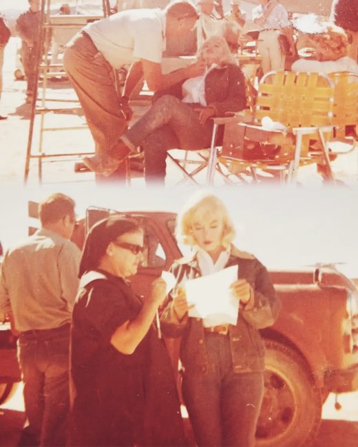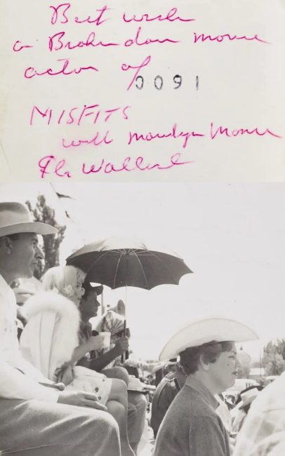 Press snapshot showing Marilyn in the bleachers with co-star Eli Wallach (who’s holding a parasol) between takes of the film’s rodeo scene.