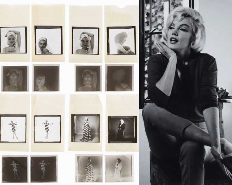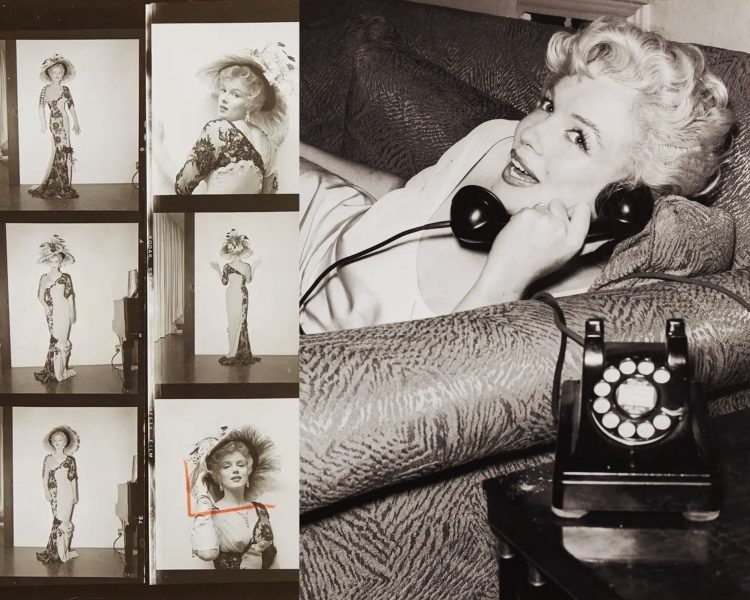 At left, a print from one of three contact sheet sets by Milton Greene, showing Marilyn wearing a costume for The Prince and the Showgirl in 1956. And at right, from the estate of celebrity makeup artist and Marilyn dollmaker Kim Goodwin, a 1990s print showing Monroe taking a phonecall during production of Some Like It Hot in 1958, when her playwright husband Arthur Miller’s conviction for contempt of congress was reversed.