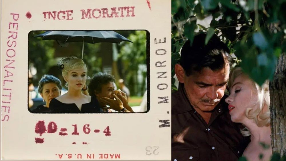 Two rare colour slides by Inge Morath. At left, Marilyn is flanked by secretary May Reis and co-star Thelma Ritter; and at right, shooting an intimate scene with leading man Clark Gable.