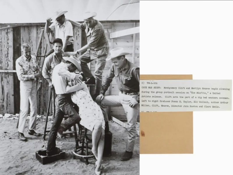 United Artists print with negative and press snipe, featuring key members of the Misfits team, in an outtake probably shot by Elliott Erwitt. Montgomery Clift jokingly plays the ‘caveman’ with Marilyn as their co-stars look on, with Huston, Miller (who wrote the screenplay), and producer Frank E. Taylor also in the picture.