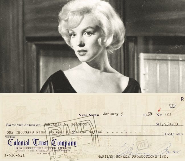 A cheque for $1,950, issued by Marilyn Monroe Productions to Benjamin W. Solomon with Marilyn’s signature, on January 5, 1959.