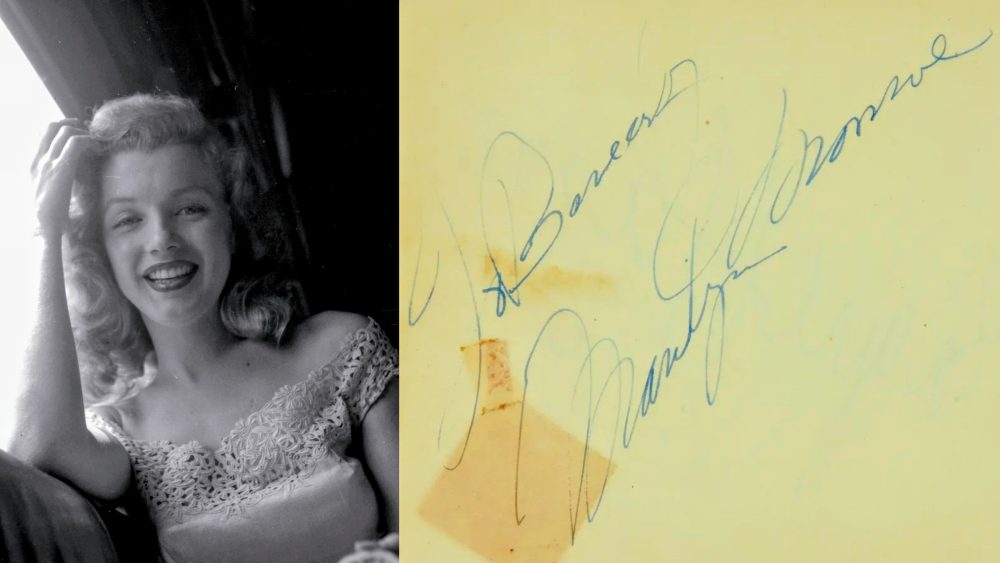 A page torn from a small book kept by autograph hunter Beverly Heon, with the inscription: ‘To Beverly / Marilyn Monroe.’ The verso features another autograph from Swedish-born actress Signe Hasso, dated 5/22/49,’ so it’s likely Marilyn’s signature also dates from 1949. (This is interesting as she had made only a few minor films at the time, and wasn’t yet well-known …)